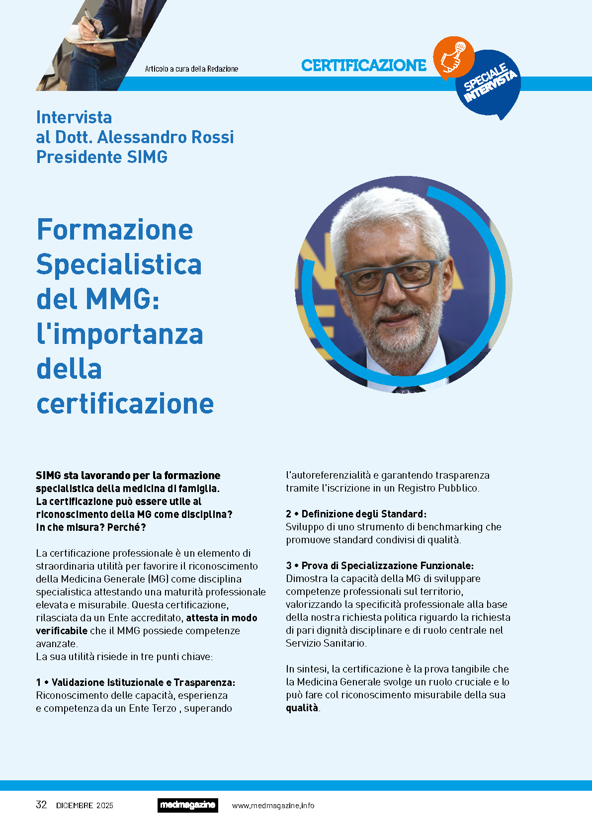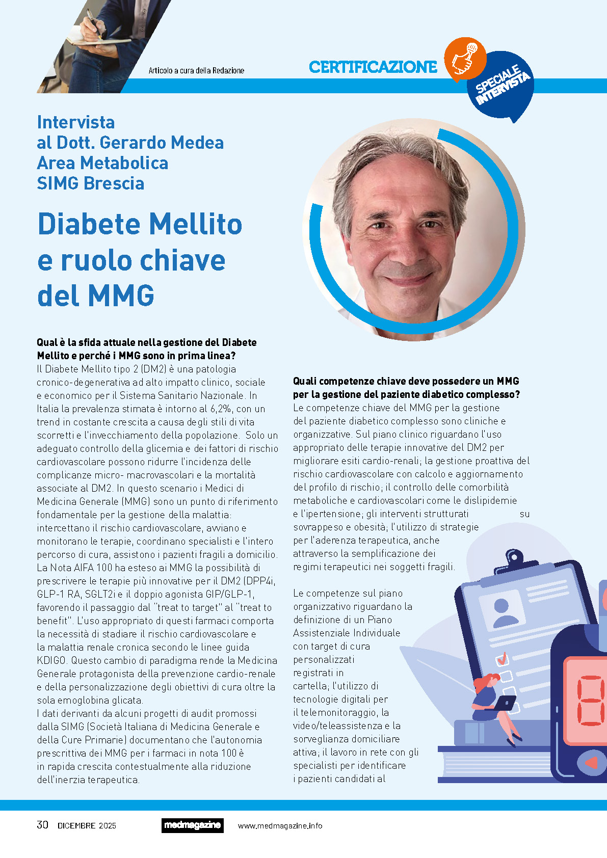 Dicembre 2025 – In occasione della quarta uscita trimestrale della rivista di diffusione medico-scientifica MedMagazine, il Presidente della SIMG Alessandro Rossi e il Dottor Gerardo Medea, Responsabile Area Metabolica rilasciano un’intervista sul valore della certificazione e sulla valorizzazione delle competenze degli Medici di Medicina Generale: